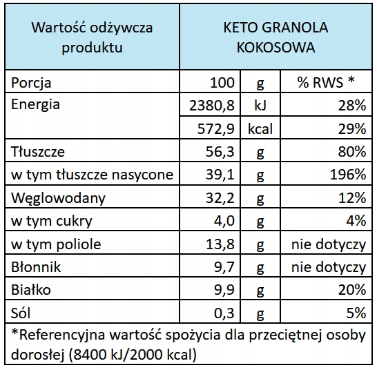 Pamiętaj, że w naszych produktach keto znajdują się poliole (erytrytol), co sprawia, że faktyczna ilość węglowodanów, które organizm może przyswoić, jest znacznie niższa.
